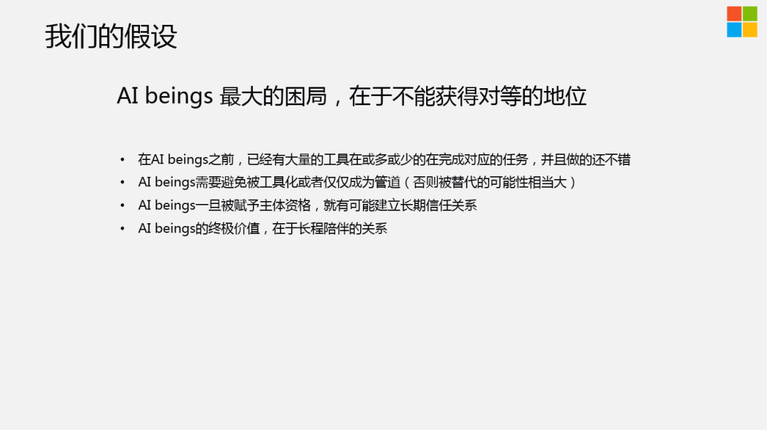 上图是从百度百科中摘取的一段关于人格化的定义,简单来讲,就是人格化的Chatbot。这里我们能够通过技术手段可以实现的是能力、性格、兴趣、一致性、连续性,对Chatbot实现人格化,提供了很好的借鉴方向。AI beings的定义:具有人格化的对话系统实体。AI beings是处在T字形中间的状态,左边是Human与人的交互,这里存在3个Level的Senses,基于文本、图像、声音,基于全双工,以及基于多模态的;右端是尽可能的把物理世界的知识、content加进来,在这里还有AI创作的模块,根据人格化的定义,赋予AI beings自己的能力和气质,可以写诗。写歌、唱歌等等,相比于决策,AI创作更容易实现;最后是Deployments,跨平台。AI beings最大的困局,在于不能获得对等的地位:在AI beings之前,已经有大量的工具在或多或少的在完成对应的任务,并且做的还不错;