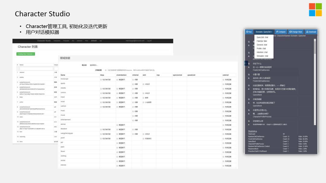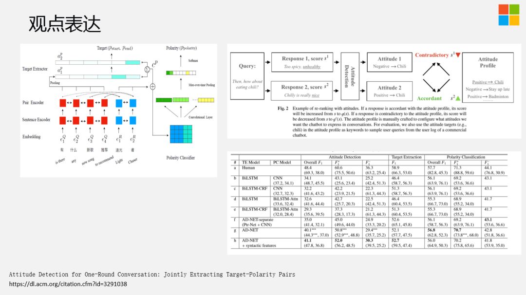 但是大家仔细一想,AI在其中起到的作用,其实不多。很多技术,如让音箱去播音乐,理论上,在十几年以前的技术就能做到。大家购买音箱的原因主要还是上面的3点,而不是其中的AI技术点。所以,AI如果仅仅是以一个上限不是那么高的实现方式呈现给大家,那么接下来很可能被其他形态的产品所替代,因为AI在系统中的价值并不是很大。整个Session其实是我们的一些理念,并不是所有的模块都做到了,也希望业界,特别是做开放领域对话的同行,能一块来探讨相关的细节。这是我们的方法论:我们会认为所有的AI beings首先需要定义她的Profile人格,包括基础属性和兴趣属性,构成一个基本的个体,再给她加上交互的能力,包括对话、声音、视觉,让她有拟人化的声音,可以清楚的看到外面的世界。于是,我们就有了一个基本的AI beings,这时我们可能需要加三观,三观这个词可能用的不是特别的好,我们大致想表达的意思是让AI beings有自己的观点,这个观点不是强行加给她的,而是在给一个初始设定之后,能通过Entailment或者Inference,做Response跟AI beings的观点一致性校验,尽可能让AI beings能体现出自己独特的存在,而不只是帮你完成任务。加入三观之后,后面还会加入创造力、技能与知识,如果有可能的话,可以做一个跨平台的部署,不管是实体的硬件中,还是虚拟的网络里,得到一个统一的交互切入点,体现出无处不在的形态。在我们内部机器人的基本特征如上,主要包括四部分:Conversation Content/Style、Domain Knowledge/Skill、Opinion、Relation。重点介绍下Conversation Content/Style:在我们内部的index中,主要是基于检索的方式对每一句话打上标签 ( tagging ),Tagging是基于性格特点,比如内向、外向、活泼、高冷,进行性格维度的刻画,需要在index中让对话语料体现出这种特点。所以我们会在L3 Post Process模块,加强人设的体现。Attitude Detection for One-Round Conversation: Jointly Extracting Target-Polarity Pairshttps://dl.acm.org/citation.cfm?id=3291038业界在做系统时,会把TAG提取和意图分开。特别是在做slot filling ( 槽位填充 ) 时,会先分意图,再做slot抽取。我们发现,如果把这两个工作组合在一起做,会有更好的效果提升。右上角是我们的一个做法,可以给她的观点根据不同的Entity,不同事物做设定,当有新的Response回来之后,会跟当前的设定做逻辑一致性校验,比如喜欢吃辣的或者不喜欢吃辣的,Response如果是吃火锅,对应的就是喜欢吃辣的,如果人设是不喜欢吃辣的,那么这种Response需要尽可能的去掉。更多详情可参考原论文。Character Studio主要是用来管理AI beings的存储。简单提下我们的用户模拟器:对话系统是一个比较复杂的过程,如果依靠人的力量做交互,是一个不太合理的方法,所以我们开发了一个对话模拟器。在里边有两个bot,一个是真实的Character bot,一个是Policy bot,Policy bot会利用共感模型等方法,分析当前的状态,来模拟用户控制对话的节奏,我们会对打造的AI beings的各种回复进行打分,哪些模块覆盖到了,哪些模块没有覆盖到。通过模拟器,我们可以非常快速的校验不同IP的Chatbot做的好不好,每个模块会有自己恒定的指标,可以检测出每个模块的具体情况。目前,我们已经上线了200+不同IP的Chatbot,如第二个,是"妲己"对话机器人,是我们跟QQ一起合作的,妲己除了是历史人物,也是王者荣耀游戏中的角色。为了活跃整个游戏群的生态,我们就做了"妲己"对话机器人,把历史上的妲己跟游戏中的妲己叠加起来,既可以问和游戏中技能相关的问题,也可以聊历史中关于妲己的话题。最右边,是我们在日本做的一个Case,在对话中做美食推荐。这个美食推荐,并不是用户想要什么,就给推荐什么,而是基于对话的节奏,尽可能的符合之前对话的过程。今天的分享主要给大家站在业界的角度,展示了小冰的产品设计思路,基础的对话系统设计,以及如何打造具有人格化的对话系统,由于时间关系,很多模块没有展开分析。在实践当中有太多难题等着我们去攻克,这是一项非常有挑战性的工作,希望能看到业内更多的小伙伴加入到这条战线当中来,谢谢大家。