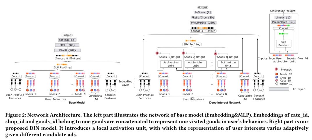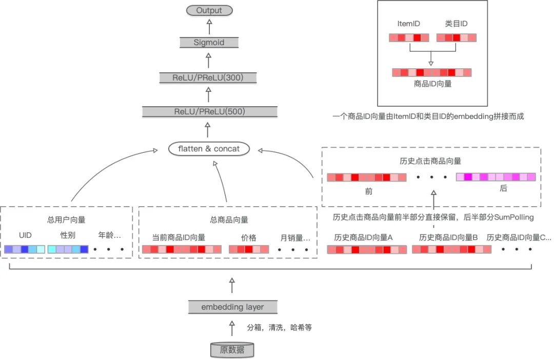 后来翻阅各种资料,受YouTube Net ( Deep Neural Networks for YouTube Recommendation )、和DIN ( Deep Interest Network ) 等文章的启发我们把用户的点击序列加入到模型当中,用户的行为序列往往能非常好的刻画该用户的兴趣分布。和DIN不同的是,我们没有对用户行为序列做attention,我仅仅把序列做了一次sum。总的来说和sum相比attention并没有明显优势,而且计算量更大。另外average的效果也略差于sum,看其他一些团队的经验貌似也有类似结论,所以我线上模型仅对序列做了sum。这一次改动auc提升了2个点左右,线上ctr有接近10%的提升。