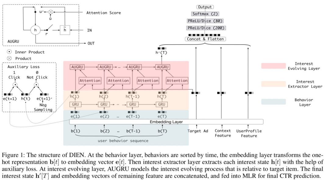 而DIEN更进一步引入RNN来提取兴趣,序列按时间先后顺序先通过RNN再对RNN的输出做attention,可以兼顾长短期兴趣及兴趣的演进,因此比DIN更加合理。
