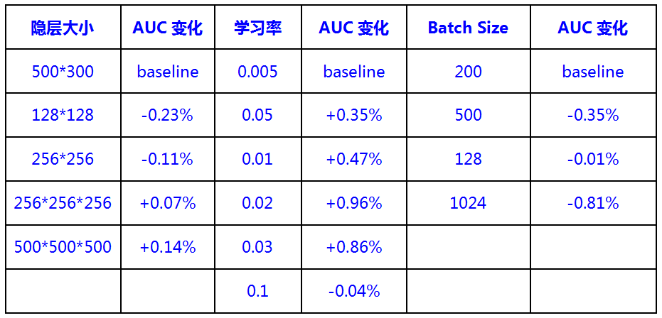 在快报的数据集分布上,改变学习率带来的提升比较明显,由于Adam优化器占用内存大,使用Adagrad所以对应的batch size较小,可能不同于其他文章中分享的经验。网络层数越高准确度越高,结构影响很小,当达到一定层数后再提升带来的收益很小,综合考虑计算成本取了500*300层。