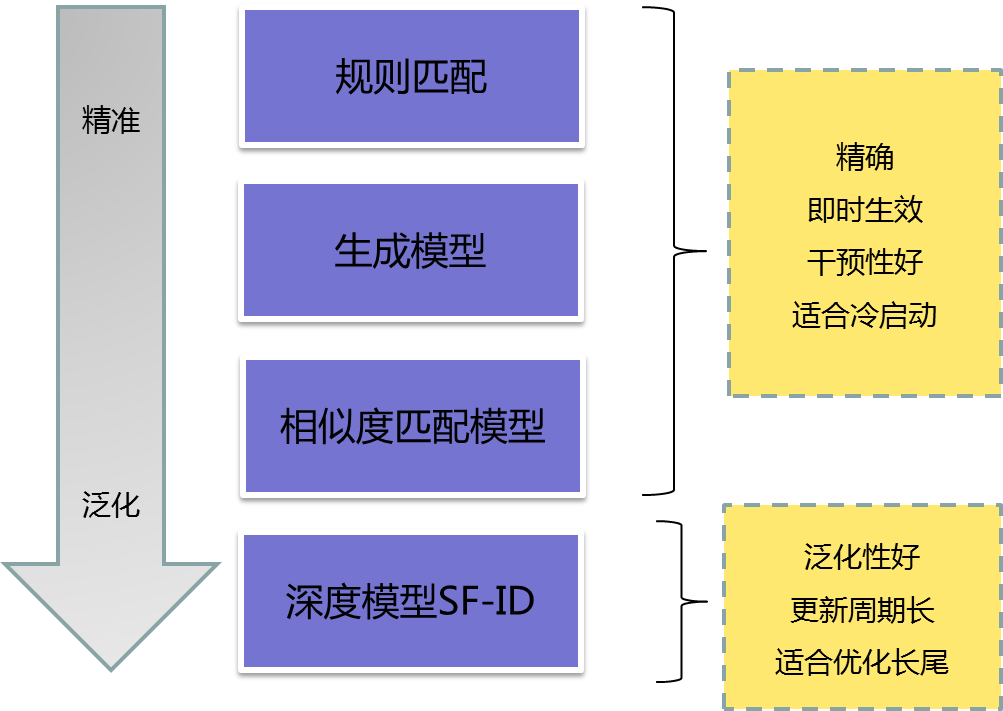 规则匹配和相似度匹配的方案大家都比较熟悉,这一节我们主要分享生成模型和深度模型。
