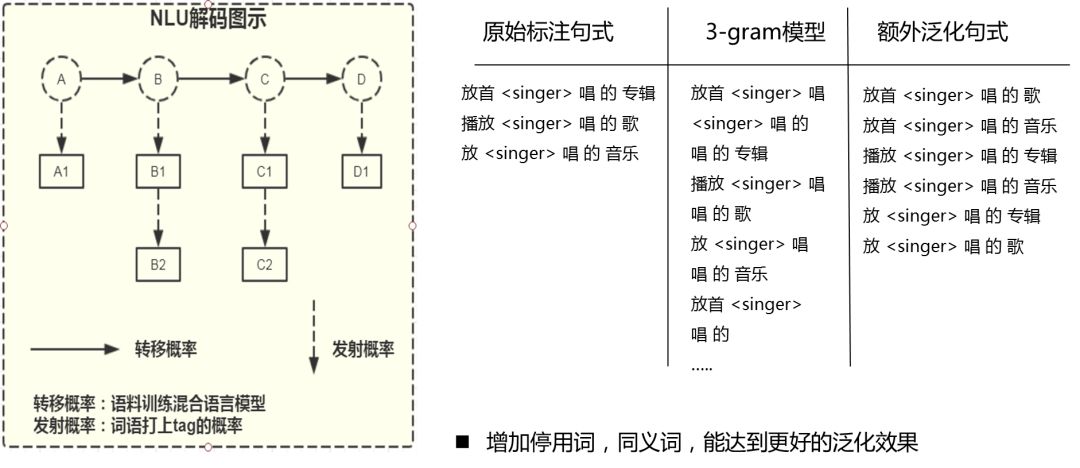 我们的生成模型是基于匹配模型的泛化,是完整精确匹配与片段式匹配的区别,类似隐马尔可夫模型,我们可以用转移序列和发射序列进行匹配。例如下图中,我们的标注人员只标注了3种句式,直接匹配只能匹配这三种说法。我们增加了 3-gram 模型进行匹配,将原始序列拆成三元片段,在这个基础上通过 beam search 进行解码,这样像例子中的3条语料,在实际匹配中可以额外泛化出6种句式,达到了很好的效果。