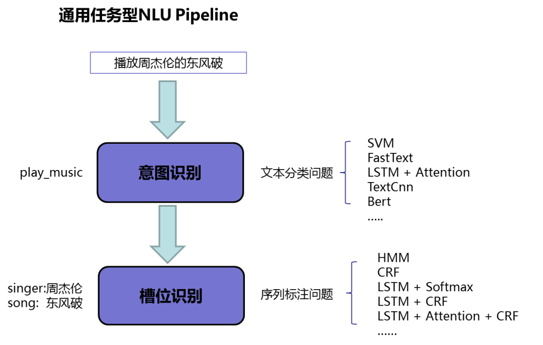 业界通用型的 NLU 一般会先过意图识别模型,再将识别出的意图传给槽位识别模型进行判断。整个 Pipeline 如下: