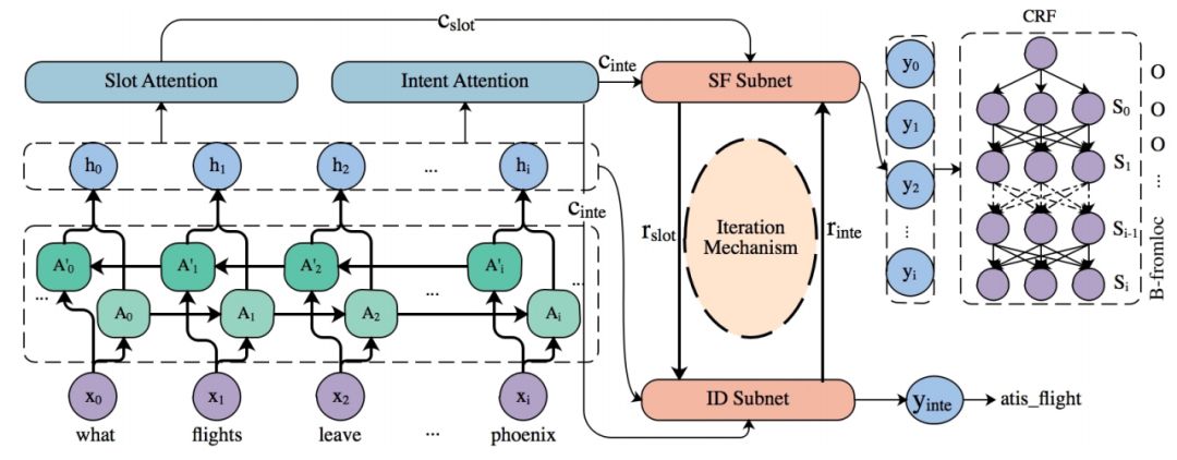 接下来,我们又更新到了 SF-ID 模型。比较巧的是这个方案的作者当时在我们组工作,也就把这个思路带来了,后来论文[2]被 ACL 2019 发表了。这个方案和 slot gate 方案的主要区别是,slot gate 方案中只有 intent 影响 slot,slot 的结果不能对 intent 起作用,还是有误差传递的情况;新方案的 SF-ID 是两个子网络,两个子网络互相迭代训练,两个子网络互相传递信息迭代,这样就把 intent 对 slot 的单向影响变成了 intent 和 slot 互相影响。大家若有兴趣,欢迎看一下参考文献中第二篇论文。