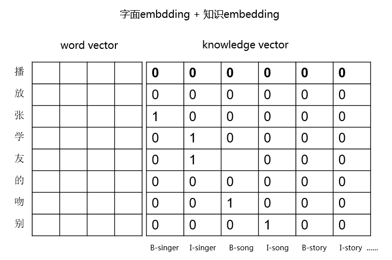 举个例子,用户说"播放张学友的吻别",我们通过外部知识可以打上标签 ( 张学友:张:B-singer、学:I-singer、友:I-singer;吻别:吻:B-song、别:I-song ),于是可以在 word embedding 的基础上增加 knowledge embedding,如图所示: