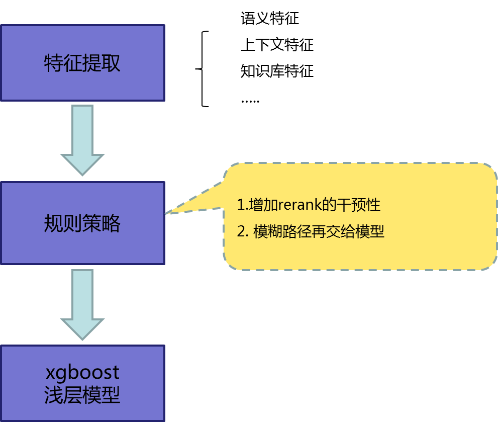 这个步骤是多路径选择消歧,即获取到多个解码路径后,我们选择一个置信度最高的,作为语义理解部分的结果。Rank 阶段我们主要采用的还是经典的 xgboost 模型+规则策略。这里规则是为了业务的可干预性,有利于产品运营人员快速解决一些业务 case。