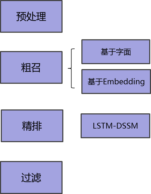 在360智能语音对话平台上,QA 系统通过预处理 -> 粗召 -> 精排 -> 过滤的流程得到最接近的答案并输出给用户。下面详细介绍一下这个流程: