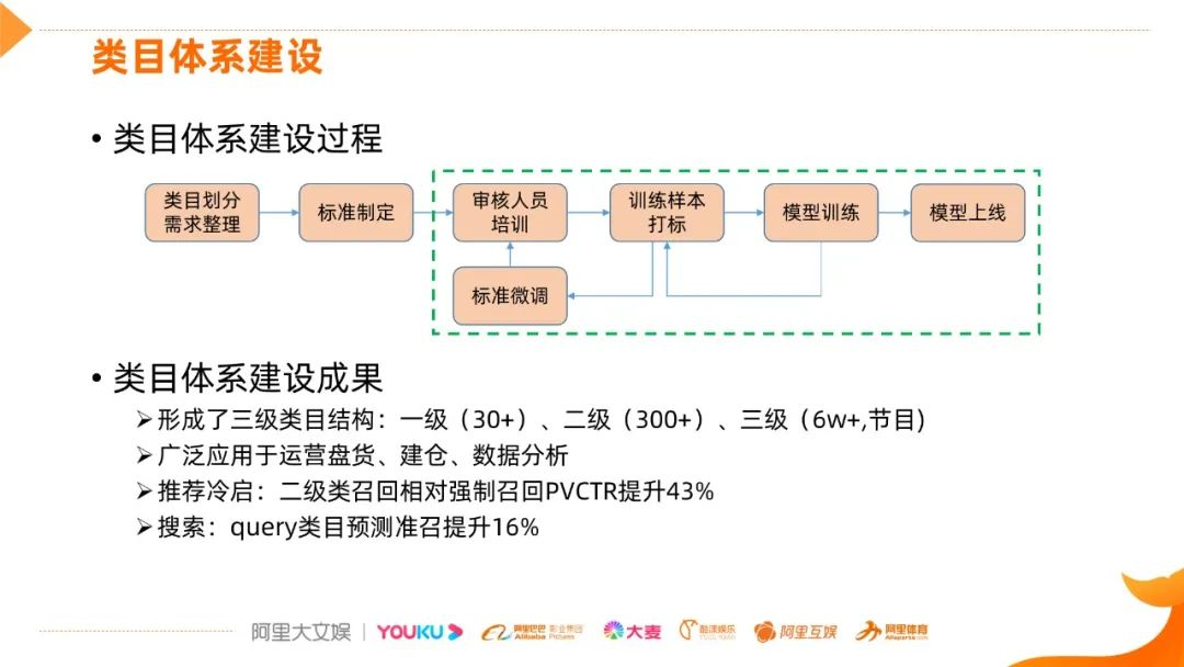 类目体系的建设过程:首先整理类目划分需求,给出制定的标准,一般是一级或二级类目,一开始这个标准是比较粗的,依据这个标准培训审核人员,做训练样本的打标,针对具体的CASE,会微调标准,这个绿色框标识的循环一直存在类目体系的建设和上线优化中,还有模型训练的自动化,提效类目体系的建设过程。