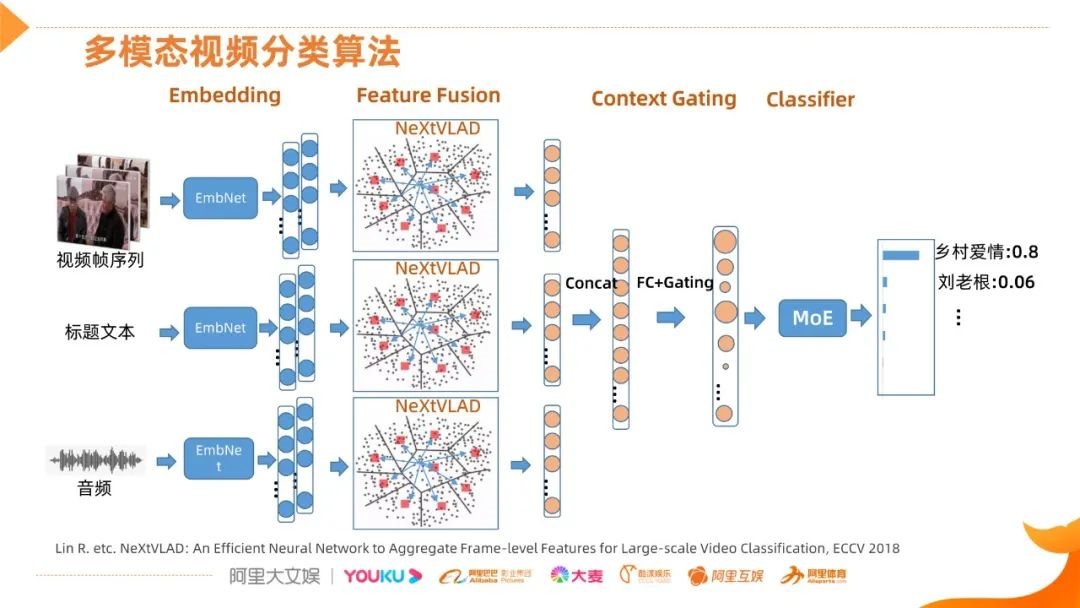 我们采用的多模态视频分类网络结构,可分为4个阶段,首先是视频信息的多模态Embedding,形成多帧的特征,然后经过一个基于聚类和残差的NeXtVLAD融合网络,这个网络目前比较常用和性能不错,融合出来就是一个单帧的feature,然后将多模态信息进行连接,通过FC做映射,另外还有一个Gating的过程,Gating过程的作用就是发掘各个维度之间关联的信息,然后有选择性地增强一些维度,抑制一些无关的维度,调整之后的信息会送到一个分类网络,这里比较常用就是MoE ( 多专家的系统 ),最终会得到一个预测结果。