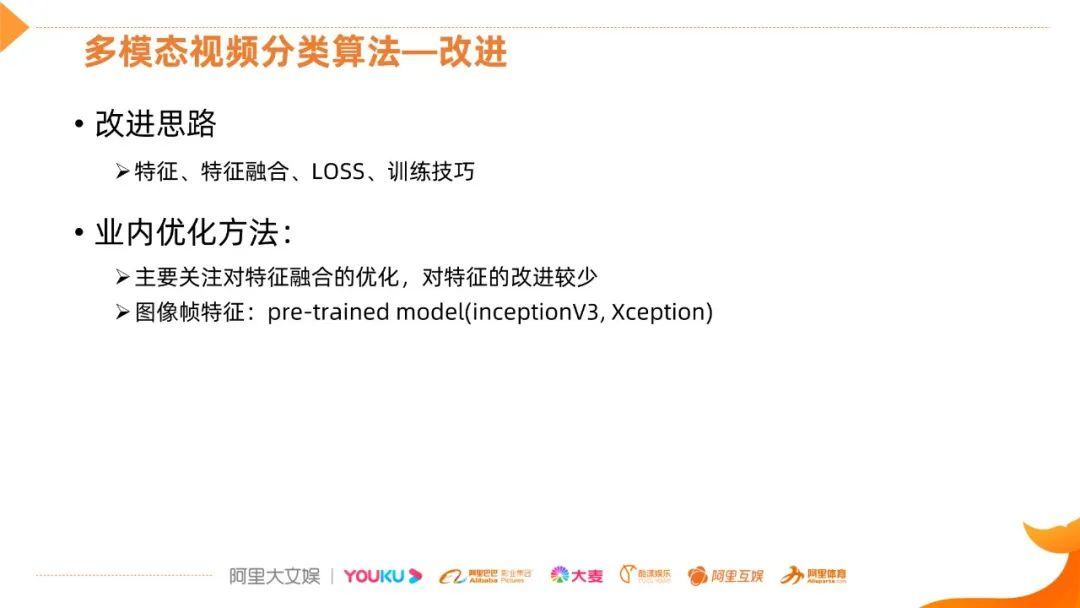我们认为多模态特征是影响整个网络的基础,所以现在这个方面做了一些努力。改进思路主要包括特征、特征融合、LOSS和一些训练技巧方面。从前期提到的问题来看,大家主要关注对特征融合的优化,对特征的改进比较少,我们之前使用的预训练的模型,效果也不错,一般是预训练的V3或Xception网络结构。