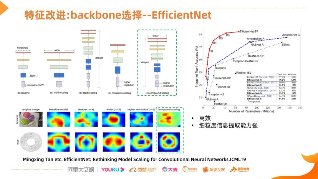 首选介绍一下我们在选择优秀backbone的尝试,最终选择了EfficientNet网络,主要有两点,它在性能和效率方面做了比较好的权衡,另外从文章可以看出对细粒度的抽取能力,也是比较好的。首先看一下右边的性能结果,横轴是网络参数,纵轴是Top-1的准确率,可以看出它的性价比远好于其他网络的,包括常用的Xception网络、残差网络,NAS搜索的网络。EfficientNet网络的思路也是比较简单、直接,因为它认为影响网络的三个维度,包括网络的深度、宽度和输入的分辨率,并不是独立的,是相互影响的,举个简单的例子,如果图像的分辨率不变的话,将这个网络进行加深的话,对后面更高层的计算是比较冗余的。EfficientNet网络就是通过暴力搜索的方式,得到这三个方面的最佳配置,具体的搜索也是通过NAS的套路。最终的结果,效率还是比较OK的,对细粒度信息提取能力来说,通过比较论文中饼干和转盘两个例子,最后一列就是EfficientNet的热力图的表现,它的高显影区域跟物体比较切合。