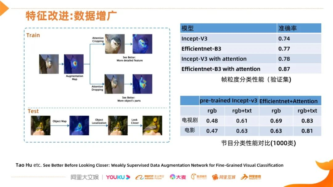 在数据增广方面,主要参考这篇文章,基本思路想通过一些措施使这个网络能学习到更丰富、更细节的信息,比如看下面这个分支,它首先得到Augmentation Map,然后擦除高显影的区域,这里叫Attention Dropping,Dropping之后的图像再送到网络学习,眼睛和嘴是直接有帮助的,但其他部位也是有区分信息的,这样网络可以学习更多其他部位的信息。另外还有一个分支,就是Cropping,就是对网络辨析能力有帮助的部位进行放大,这样可以看得更清楚,也是提升网络对细节分分辨能力的措施。下面就是测试阶段,也是根据热力图响应,扣出高显影区域,也会提取特征,这样两个特征结合,得到很好的细粒度理解。我们主要借鉴训练阶段的这两个操作。我们从图像分类和节目分类两方面来展示了性能的提升情况,从对比结果看,首先好的backbone能带来不错的性能提升 ( 0.74->0.77 ),加入attention之后又带来了更大的提升 ( 0.77->0.87 ),而且也显示出了优秀backbone的巨大提升潜力 ( 0.04 vs 0.10 )。