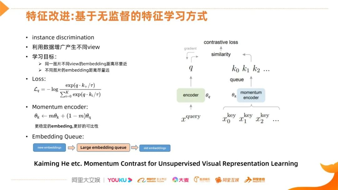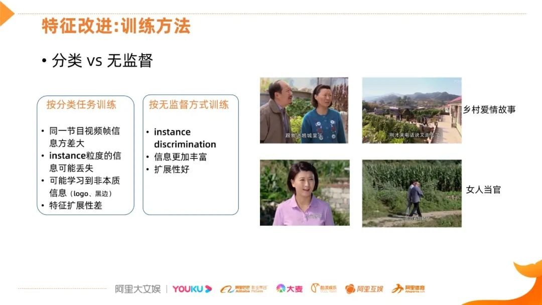 在训练方式上,主要是基于分类和无监督,在基于分类任务的训练方式有一些缺点,不像imagenet中每个类都有共同的特点,节目分类问题中,同一节目视频帧的信息方差比较大,比如说,《乡村爱情故事》和《女人当官》有主要人物的帧,也有背景的帧,这两种帧的信息差异非常大,如果强制分成一类的话,Embedding就比较接近,对网络产生一些困惑,从结果看也会丢失了一些信息,比如说丢失背景。另一个是基于分类的任务,可能学到一些非本质的信息,如Logo或黑边,这样会导致特征的扩展性比较差,在大类别的分类上很快就达到性能上限。