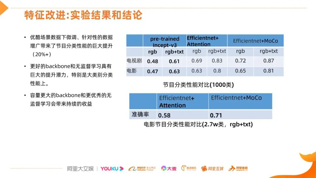对比预训练的模型下,在优酷场景数据下微调,针对性的数据增广在节目分类问题上带来了20%以上的提升;