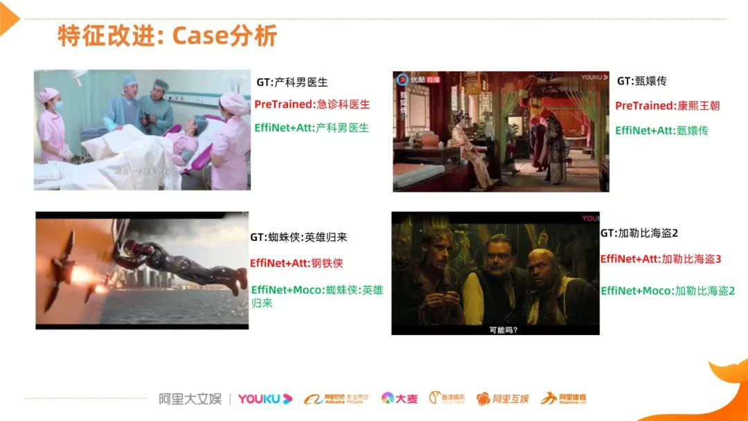 经过这些优化后,特征的细粒度的区分能力有了很大的增强。上面两张图是预训练网络和EffiNet+Attention网络的结果,第一张图实际上是产科男医生,PreTrained识别为急诊科医生,第二张的甄嬛传识别为康熙王朝。后面这两图对比了更难的图片,加勒比海盗2和3需要更精细的区分能力,才能得到更好的分类结果。