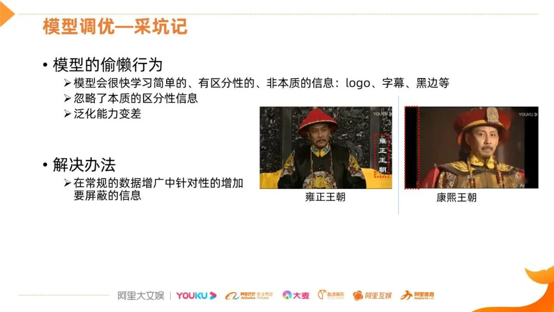 最后,分享下我们在模型调优过程中踩的坑,首先模型的偷懒行为,所谓的偷懒,特别是对于分类任务来说,模型会很快学习到一些简单的,有区分性的信息,但这些信息可能是非本质的,比如字幕信息、黑边、logo的信息,对雍正王朝和康熙王朝两个类,网络很容易就学到了黑边这个区分性很强的信息,如果不对这些信息做处理,得到的模型的泛化能力会很差的。解决的方法,一个是在常规的数据增广中针对性的增加要屏蔽的信息,像前面提到的Attention Dropping和Augmentation Map等方法,另一种方法是我们会对所有的数据加一些黑边或logo,就是你想抑制哪些信息,就普遍性的增加这些信息,使其没有差别性。