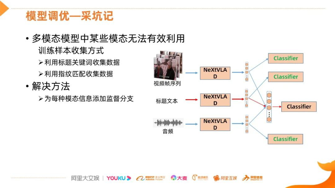 第二点是多模态模型中的偷懒行为,主要跟训练样本的收集有关,运营一般会利用标题关键词收集数据,比如收集相声的数据,会用"德云社"、"郭德纲"等来收集样本,这些样本扔到多模态网络的话,标题信息的分支会很快收敛的,虽然网络的分类性能比较好,但最终学习到的网络会忽略其他维度的信息,这样对标题中没有这些关键词的视频,分类性能就很差,泛化能力差;同样,我们的训练样本也会用到指纹匹配的数据,指纹匹配得到的样本相对于那些经过编辑的视频,画面的多样性就稍差一些,分类网络学习中也会出现类似标题关键词的问题,但并不很严重。解决方法是为每类模态信息增加监督分类器,它们的Loss会加在一起训练,这样的好处是其中的一个分支的Loss比较小的话,其他分支的Loss比较大,最终优化的结果是,各个信息分支的loss都很低,这样就能促使网络充分利用各个模态的信息。