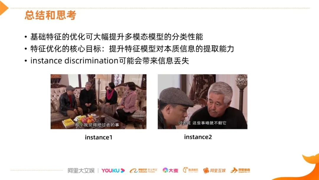 另外,对于基于instance discrimination的无监督的区分方法做过一些思考,比如上图,这两帧是同一个视频片段的,画面信息比较接近,但是在MoCo这种无监督学习里面,会看成两个完全不同的instance,如果要强制区分的话,会迫使网络学习到一些不太重要的背景,这样会导致信息的丢失。所以在视频帧分类中不能完全使用instance区分的方式。