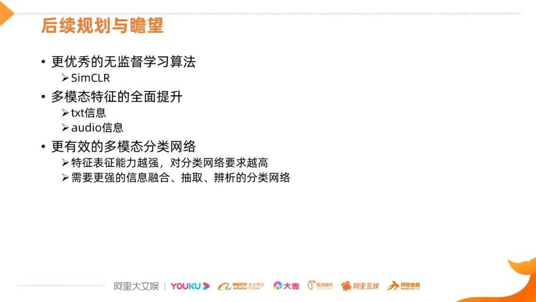 后续我们会探索更优秀的无监督学习算法,比如目前的SimCLR,加入了一个非线性映射转换要学习的embedding,另外,在多模态信息中全面提升特征,还有寻求更有效的多模态分类网络,因为特征表征能力越强,哪些信息有用,哪些信息没用,它并不关心,而是交给了后面的分类网络,做更强信息的融合、抽取和辨析。