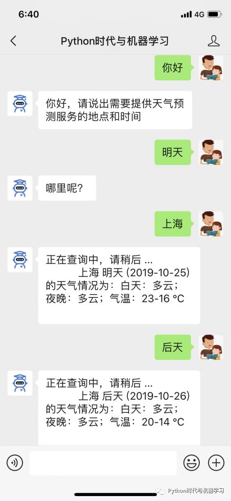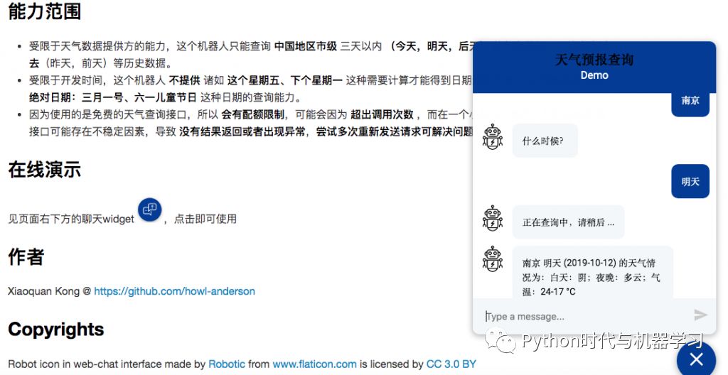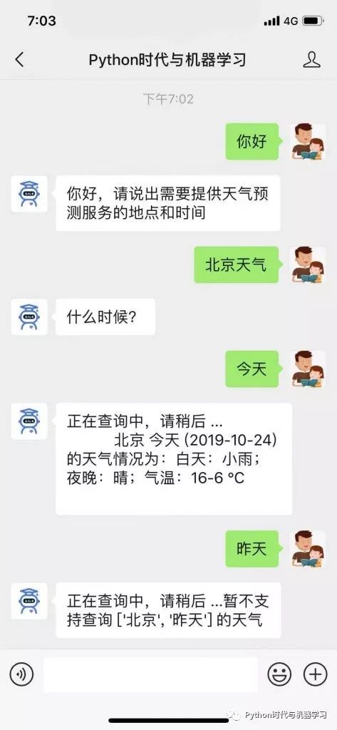 这个查询机器人可以根据用户提供的城市(北京、上海等)和日期(明天、后天等),查询出相应的天气预报,作者也给出了受限功能说明,很细致: