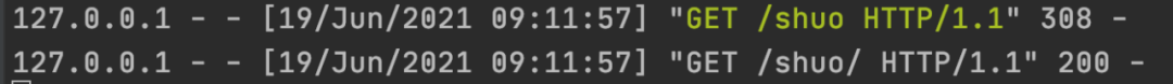 这是为什么呢?这其中是 flask 保证 url 唯一性的举措。打开终端日志我们会发现,当你以 /shuo 形式进行访问时,其实进行了一次 308 重定向的过程,将 /shuo 转到了 /shuo/ 上,以保证 url 的唯一性。