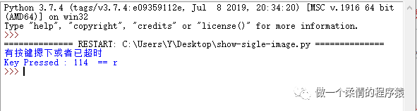 import cv2# 创建一个窗口cv2.namedWindow('image')while True: # 等待按键事件发生 key_code = cv2.waitKey(1000) if key_code != -1: print('key {} pressed!!! value={}'.format(chr(key_code), key_code)) if chr(key_code) == 'q': # 退出程序 print('Quit') break else: # 没有按键按下 print('no key pressed , wait 1s')cv2.destroyWindow('image')