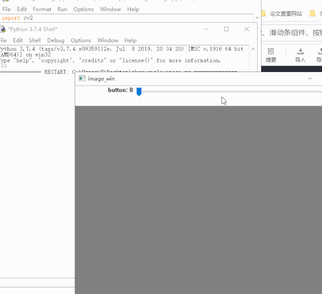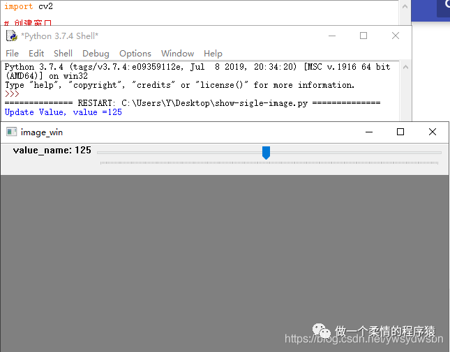 # 这个nothing的意思就是啥也不做。def nothing(x): print(x)cv2.createTrackbar('gray_value','image',0,255,nothing)