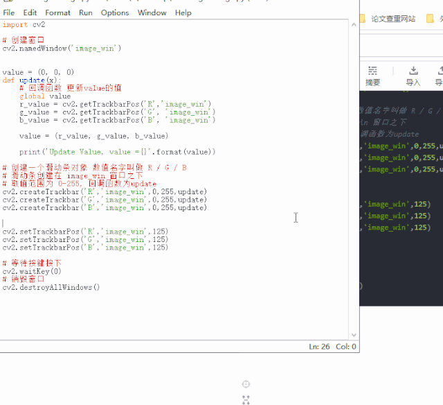 import cv2# 创建窗口cv2.namedWindow('image_win')value = (0, 0, 0)def update(x): # 回调函数 更新value的值 global value r_value = cv2.getTrackbarPos('R','image_win') g_value = cv2.getTrackbarPos('G', 'image_win') b_value = cv2.getTrackbarPos('B', 'image_win') value = (r_value, g_value, b_value) print('Update Value, value ={}'.format(value))# 创建一个滑动条对象 数值名字叫做 R G B# 滑动条创建在 image_win 窗口之下# 取值范围为 0-255, 回调函数为updatecv2.createTrackbar('R','image_win',0,255,update)cv2.createTrackbar('G','image_win',0,255,update)cv2.createTrackbar('B','image_win',0,255,update)cv2.setTrackbarPos('R','image_win',125)cv2.setTrackbarPos('G','image_win',125)cv2.setTrackbarPos('B','image_win',125)# 等待按键按下cv2.waitKey(0)# 销毁窗口cv2.destroyAllWindows()