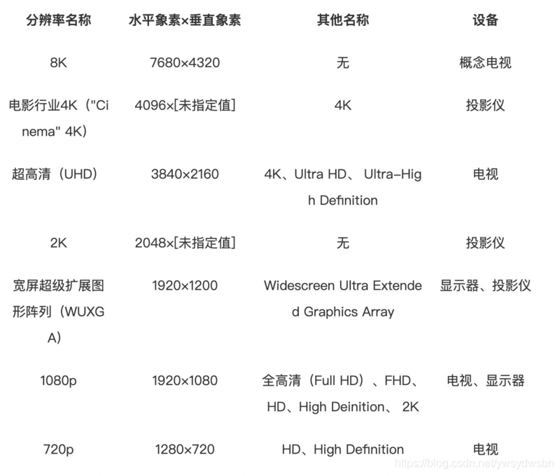 1K=1024,2K=2048,4K=4096,8K=8192,代表着1K图像即水平方向上有1024个像素的图像,2K图像即水平方向上有2048个像素的图像,以此类推,8K图像即水平方向上有8192个像素的图像。也就是说p表示的是逐行扫描的行数,而k表示的是不考虑屏宽比情况下的列数,是两个维度,理论上来讲1080p也可以称为2k。以下是常见的分辨率描述。