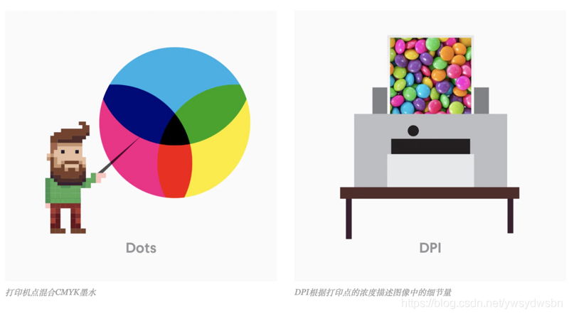 可以看到dpi和ppi其实都是描述单位长度上的呈像细节,区别在于屏幕成像的最小单位是像素所以用ppi描述像素分辨率,而印刷是用墨点的所以衡量单位就是点,用dpi来描述扫描精度。
