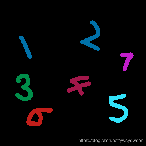 import numpy as npimport cv2# 读入黑背景下的彩色手写数字img = cv2.imread("color_number_handwriting.png")# 转换为gray灰度图gray = cv2.cvtColor(img, cv2.COLOR_BGR2GRAY)# 寻找轮廓contours, hier = cv2.findContours(gray, cv2.RETR_EXTERNAL, cv2.CHAIN_APPROX_SIMPLE)# 声明画布 拷贝自imgcanvas = np.copy(img)for cidx,cnt in enumerate(contours):minAreaRect = cv2.minAreaRect(cnt)# 转换为整数点集坐标rectCnt = np.int64(cv2.boxPoints(minAreaRect))# 绘制多边形cv2.polylines(img=canvas, pts=[rectCnt], isClosed=True, color=(0,0,255), thickness=3)cv2.imwrite("number_minarearect_canvas.png", canvas)