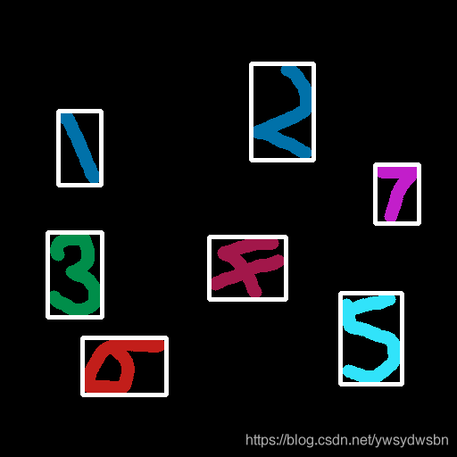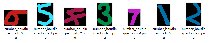 import numpy as npimport cv2# 读入黑背景下的彩色手写数字img = cv2.imread("color_number_handwriting.png")# 转换为gray灰度图gray = cv2.cvtColor(img, cv2.COLOR_BGR2GRAY)# 寻找轮廓contours, hier = cv2.findContours(gray, cv2.RETR_EXTERNAL, cv2.CHAIN_APPROX_SIMPLE)# 声明画布 拷贝自imgcanvas = np.copy(img)for cidx,cnt in enumerate(contours):(x, y, w, h) = cv2.boundingRect(cnt)print('RECT: x={}, y={}, w={}, h={}'.format(x, y, w, h))# 原图绘制圆形cv2.rectangle(canvas, pt1=(x, y), pt2=(x+w, y+h),color=(255, 255, 255), thickness=3)# 截取ROI图像cv2.imwrite("number_boudingrect_cidx_{}.png".format(cidx), img[y:y+h, x:x+w])cv2.imwrite("number_boundingrect_canvas.png", canvas)