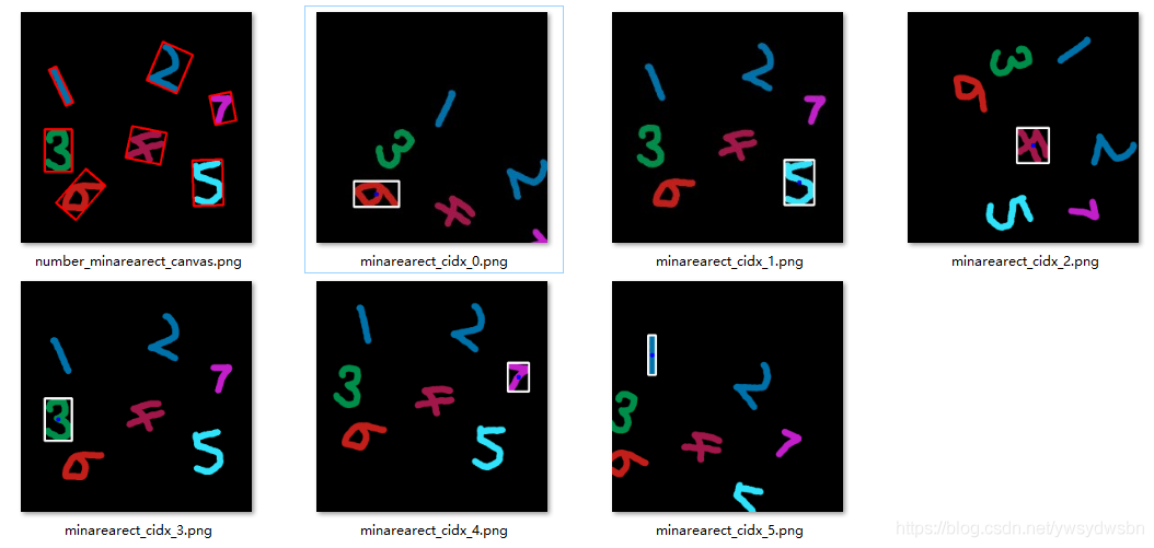 '''利用minAreaRect绘制最小面积矩形并绘制'''import numpy as npimport cv2# 读入黑背景下的彩色手写数字img = cv2.imread("color_number_handwriting.png")# 转换为gray灰度图gray = cv2.cvtColor(img, cv2.COLOR_BGR2GRAY)# 寻找轮廓contours, hier = cv2.findContours(gray, cv2.RETR_EXTERNAL, cv2.CHAIN_APPROX_SIMPLE)for cidx,cnt in enumerate(contours):minAreaRect = cv2.minAreaRect(cnt)# 转换为整数点集坐标# rectCnt = np.int64(cv2.boxPoints(minAreaRect))((cx, cy), (w, h), theta) = minAreaRectcx = int(cx)cy = int(cy)w = int(w)h = int(h)# 获取旋转矩阵rotateMatrix = cv2.getRotationMatrix2D((cx, cy), theta, 1.0)rotatedImg = cv2.warpAffine(img, rotateMatrix, (img.shape[1], img.shape[0]))pt1 = (int(cx - w/2), int(cy - h/2))pt2 = (int(cx + w/2), int(cy + h/2))# 原图绘制矩形区域cv2.rectangle(rotatedImg, pt1=pt1, pt2=pt2,color=(255, 255, 255), thickness=3)# 绘制中心点cv2.circle(rotatedImg, (cx, cy), 5, color=(255, 0, 0), thickness=-1)cv2.imwrite("minarearect_cidx_{}.png".format(cidx), rotatedImg)