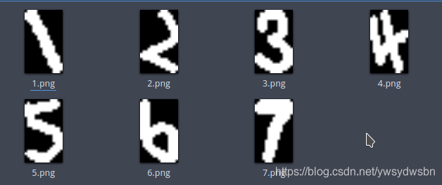 import numpy as npimport cv2from glob import globimg_paths = glob('./数字图像处理/*.png')# 新的维度为10×20new_dimension = (15, 25)for img_path in img_paths:# 读入灰度图img = cv2.imread(img_path,cv2.IMREAD_GRAYSCALE)img_name = img_path.split('/')[-1]# 缩放resized = cv2.resize(img, new_dimension)# 二值化图片ret,thresh = cv2.threshold(resized,10,255,0)cv2.imwrite('./number/'+img_name,thresh)