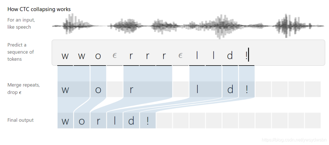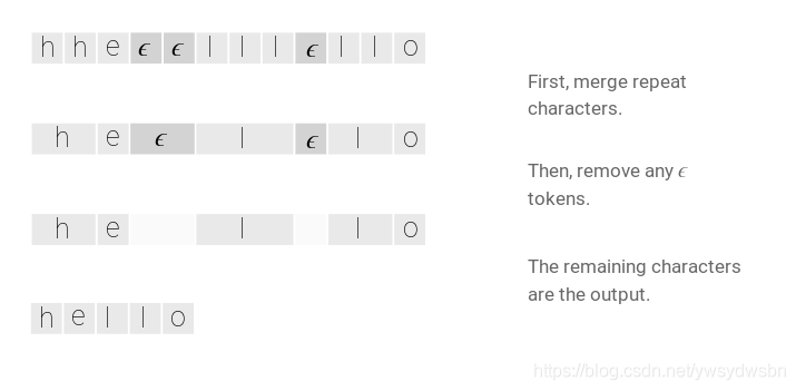 为了解决上述问题,CTC引入了一个新的特殊符号ϵ,它表示空字符,在最后我们会去掉它。如下图所示,首先有些输入可以对应空字符,这样我们可以解决第一个问题。同样由于有了空字符,我们可以区分连续的字符。