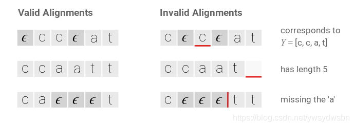如果输出有两个连续相同的字符,那么它们之间一定要有至少一个空字符,这样我们就可以区分hello和helo了。对于之前长度为6的输入,输出为cat的例子,下图是一些合法的和非法的CTC对齐的例子。