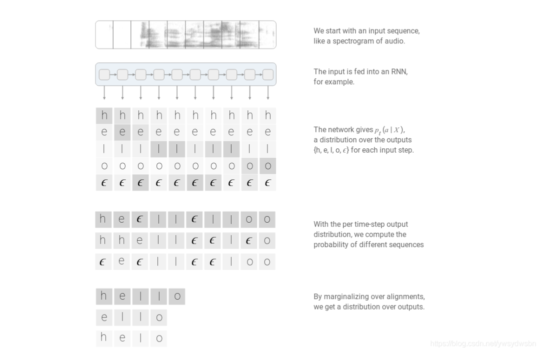 在上图中,最上面是我们的输入序列,比如在语音识别中,输入是帧的序列,每一帧可以提取其MFCC作为其特征向量。然后我们可以把输入序列feed进一个RNN模型。这个RNN模型会计算每一个时刻t的输出的概率分布pt(a|X),表示t时刻输出字符a的概率,这这个例子里可能的字符是{h,e,l,o,ϵ}。假设输入的长度为T,那么理论上有5T中不同的对齐方式(路径),当然有些概率很低,我们可以忽略。这些路径中有一些的输出是一样的,比如都是”hello”,我们把它的概率加起来就得到了P(“hello”|X)的概率。