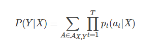 这样我们就可以用动态规划高效的计算P(Y|X),因为P(Y|X)是合法路径上点的累积,每个点对于pt(zt|X),而pt(zt|X)又是一个可以求导的模型(比如RNN),因此最终P(Y|X)是可以求导的。对于训练数据(X,Y),我们的优化目标一般是最大化P(Y|X),因此我们也可以定义损失函数为: