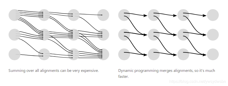 在使用CTC的时候我们通常用RNN来估计每个时刻的输出pt(at|X)。因为RNN可以很好的建模序列标注问题,但是CTC并没有要求一定用什么样的模型。给定X和Y,如果我们直接遍历所有的路径,那么效率会非常低,因为路径会随着T指数增加。不过我们可以使用动态规划技术来提高计算效率,这项技术在HMM里也用到过。
