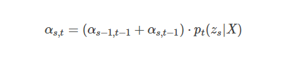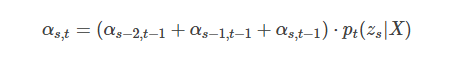 我们在计算t时刻的α的时候有两类情况:一类是对齐的时候可以不能跳过zs−1的;另一类是能跳过zs−1的。