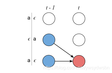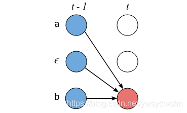 第二种情况,如下图所示。zs−2=a,zs−1=ϵ,zs=b。和前面的分析一样,很明显X1:t−1可以对齐到Z1:s或者Z1:s−1。那它能不能对齐到Z1:s−2呢?这是可以的,因为可以让xt−1对齐到a,xt对齐到b,中间的ϵ在这种情况下是可以跳过的。