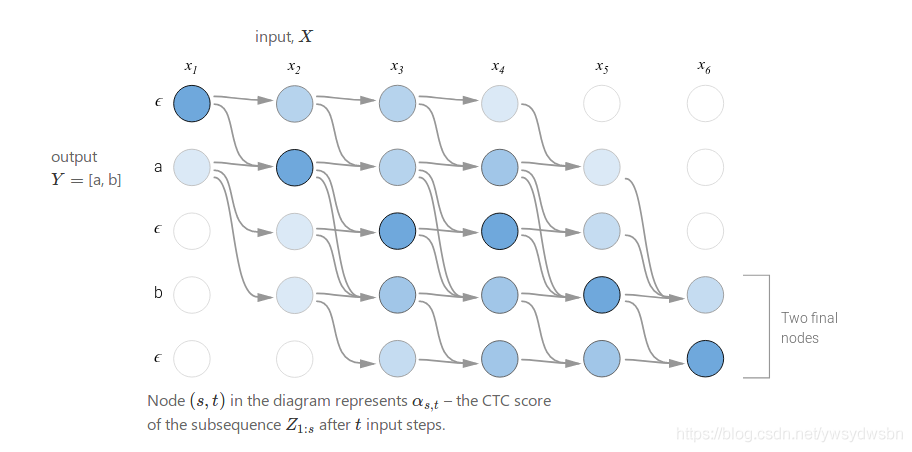 因为在输出Y的任意两个字符之间都可以对应空字符(比如语音识别的任意两个音素直接都可以有silence),所有我们在Y的每个字符直接都插入空字符得到Z=[ϵ,y1,ϵ,y2,…,yU,ϵ]。假设αs,t表示输入序列的前s个字符X1:s和输出的前t个字符Z1:t对齐时所有合法路径的概率和。有了t时刻之前的α,我们就可以计算t时刻的α,这样我们就能使用动态规划算法。最后得到T时刻的α之后我们就可以得到P(Y|X)。
