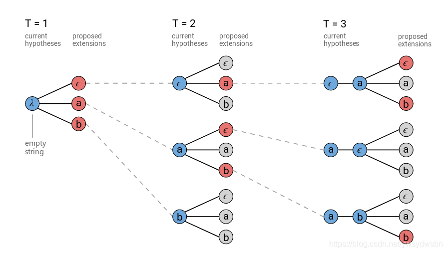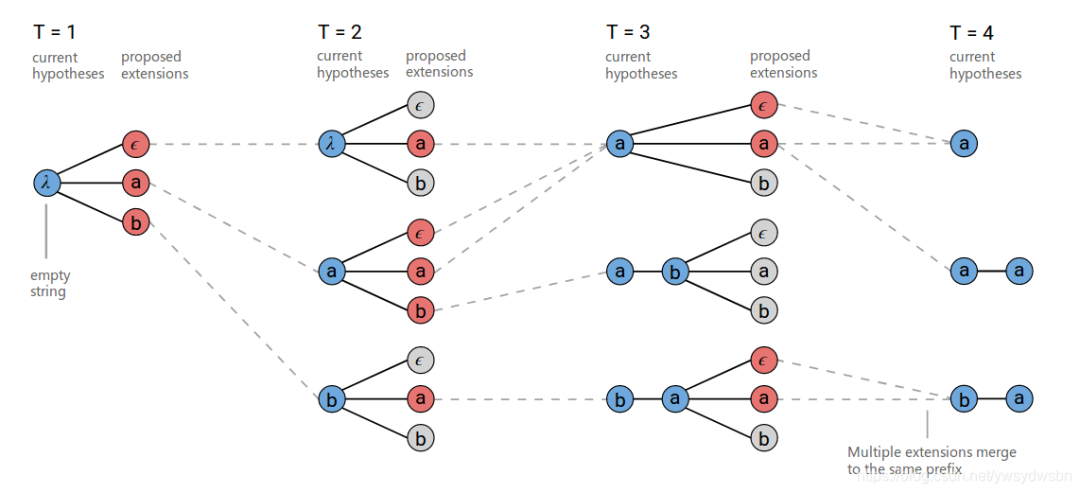 普通的Beam Search方法会在每个时刻保留最优的N条路径,然后在t+1时刻对这N条路径展开,然后从所有展开的路径中选择最优的N条路径,。。。,一直到最终时刻T。下图是使用普通Beam Search算法的示例。在图中,我们发现在t=3的时候,有两条路径的输出都是a(分别是[a,ϵ]和[ϵ,a]),它们(有可能)是可以合并的(请读者思考为什么是有可能而不是一定?)。
