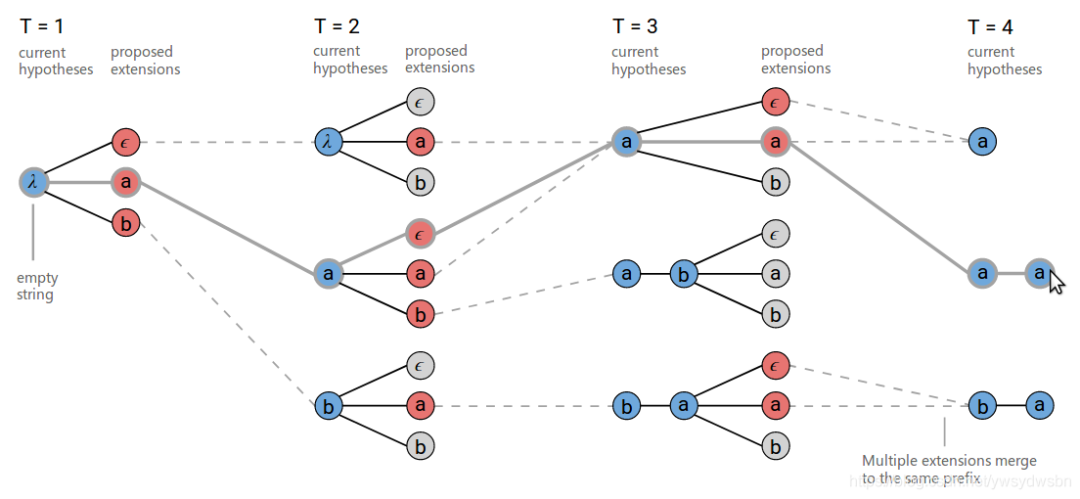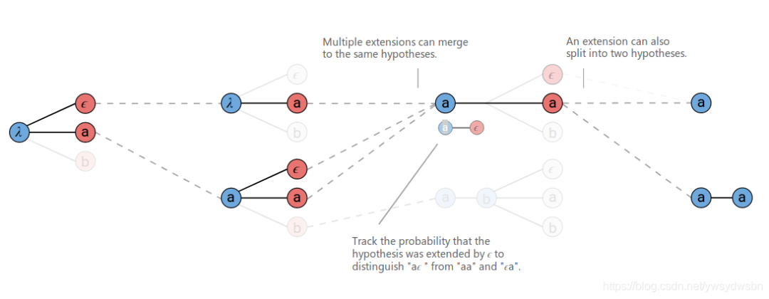为了区分,我们需要在t=2到t=3的合并的时候记下哪些路径的最后一个字符是空,哪些不是。在上图的例子中路径[ϵ,a]和[a,a]的结尾不是空,而路径[a,ϵ]的结尾是空,因此当t=3到t=4值遇到a的时候,前两条路径只能输出a,而后一条路径既能输出a也能输出a-a。
