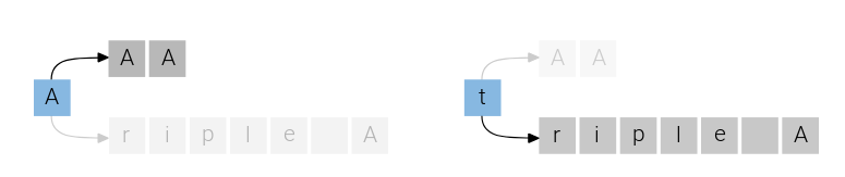 CTC经常被诟病的一个特点就是它的条件独立性。这个模型假设给定X的时候不同时刻的yt是独立的,这个假设对于很多序列标注问题来说是不合理的。假设一个语音是要说”三个A“,它有两种说法:”三个A(triple A)”;”AAA”。如果第一个输出是A,那么第二个输出A的概率应该变大;类似的如果第一个输出是t(英文的triple的t),那么输出triple A的概率更大,如下图所示。但是CTC无法建模这种关系。