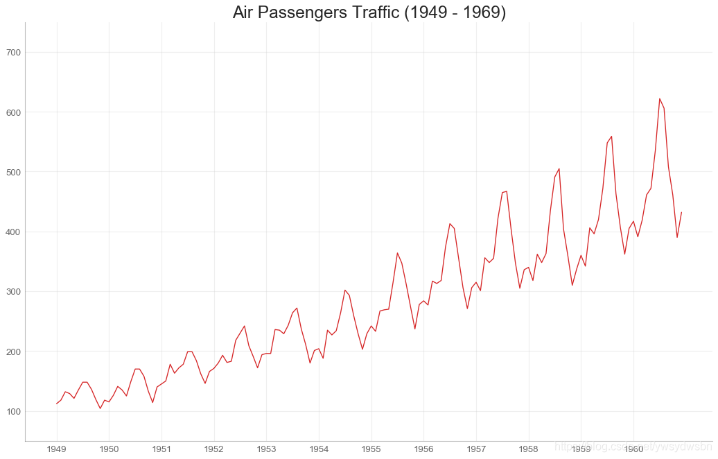 # Import Datadf = pd.read_csv('https://github.com/selva86/datasets/raw/master/AirPassengers.csv')# Draw Plotplt.figure(figsize=(16,10), dpi= 80)plt.plot('date', 'traffic', data=df, color='tab:red')# Decorationplt.ylim(50, 750)xtick_location = df.index.tolist()[::12]xtick_labels = [x[-4:] for x in df.date.tolist()[::12]]plt.xticks(ticks=xtick_location, labels=xtick_labels, rotation=0, fontsize=12, horizontalalignment='center', alpha=.7)plt.yticks(fontsize=12, alpha=.7)plt.title("Air Passengers Traffic (1949 - 1969)", fontsize=22)plt.grid(axis='both', alpha=.3)# Remove bordersplt.gca().spines["top"].set_alpha(0.0)plt.gca().spines["bottom"].set_alpha(0.3)plt.gca().spines["right"].set_alpha(0.0)plt.gca().spines["left"].set_alpha(0.3)plt.show()