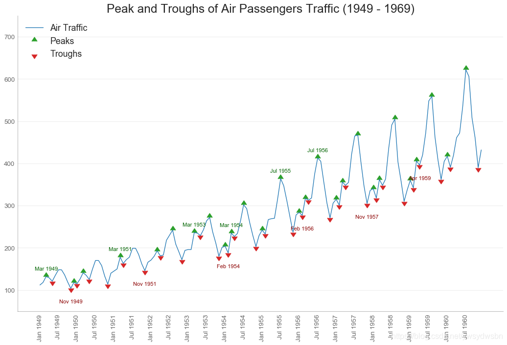 # Import Datadf = pd.read_csv('https://github.com/selva86/datasets/raw/master/AirPassengers.csv')# Get the Peaks and Troughsdata = df['traffic'].valuesdoublediff = np.diff(np.sign(np.diff(data)))peak_locations = np.where(doublediff == -2)[0] + 1doublediff2 = np.diff(np.sign(np.diff(-1*data)))trough_locations = np.where(doublediff2 == -2)[0] + 1# Draw Plotplt.figure(figsize=(16,10), dpi= 80)plt.plot('date', 'traffic', data=df, color='tab:blue', label='Air Traffic')plt.scatter(df.date[peak_locations], df.traffic[peak_locations], marker=mpl.markers.CARETUPBASE, color='tab:green', s=100, label='Peaks')plt.scatter(df.date[trough_locations], df.traffic[trough_locations], marker=mpl.markers.CARETDOWNBASE, color='tab:red', s=100, label='Troughs')# Annotatefor t, p in zip(trough_locations[1::5], peak_locations[::3]):plt.text(df.date[p], df.traffic[p]+15, df.date[p], horizontalalignment='center', color='darkgreen')plt.text(df.date[t], df.traffic[t]-35, df.date[t], horizontalalignment='center', color='darkred')# Decorationplt.ylim(50,750)xtick_location = df.index.tolist()[::6]xtick_labels = df.date.tolist()[::6]plt.xticks(ticks=xtick_location, labels=xtick_labels, rotation=90, fontsize=12, alpha=.7)plt.title("Peak and Troughs of Air Passengers Traffic (1949 - 1969)", fontsize=22)plt.yticks(fontsize=12, alpha=.7)# Lighten bordersplt.gca().spines["top"].set_alpha(.0)plt.gca().spines["bottom"].set_alpha(.3)plt.gca().spines["right"].set_alpha(.0)plt.gca().spines["left"].set_alpha(.3)plt.legend(loc='upper left')plt.grid(axis='y', alpha=.3)plt.show()
