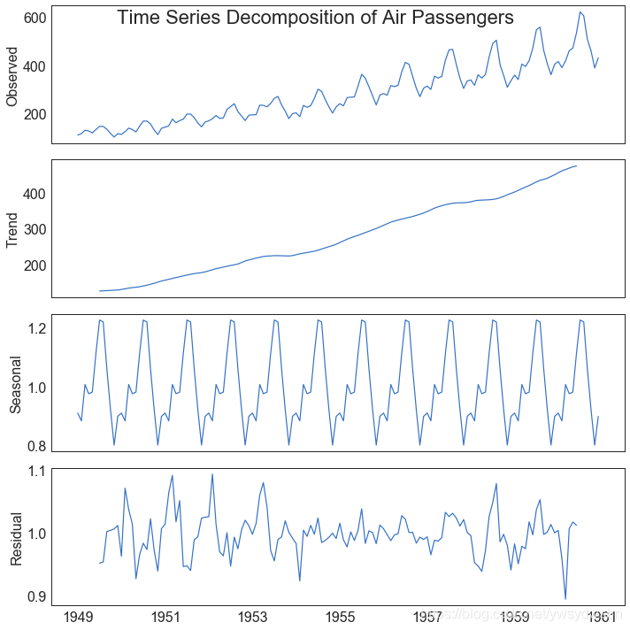 from statsmodels.tsa.seasonal import seasonal_decomposefrom dateutil.parser import parse# Import Datadf = pd.read_csv('https://github.com/selva86/datasets/raw/master/AirPassengers.csv')dates = pd.DatetimeIndex([parse(d).strftime('%Y-%m-01') for d in df['date']])df.set_index(dates, inplace=True)# Decomposeresult = seasonal_decompose(df['traffic'], model='multiplicative')# Plotplt.rcParams.update({'figure.figsize': (10,10)})result.plot().suptitle('Time Series Decomposition of Air Passengers')plt.show()