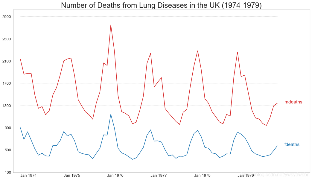 # Import Datadf = pd.read_csv('https://github.com/selva86/datasets/raw/master/mortality.csv')# Define the upper limit, lower limit, interval of Y axis and colorsy_LL = 100y_UL = int(df.iloc[:, 1:].max().max()*1.1)y_interval = 400mycolors = ['tab:red', 'tab:blue', 'tab:green', 'tab:orange']# Draw Plot and Annotatefig, ax = plt.subplots(1,1,figsize=(16, 9), dpi= 80)columns = df.columns[1:]for i, column in enumerate(columns):# 原文此处有误,Python数据之道 备注# 访问 liyangbit.com , 查看本文完整内容plt.plot(df.date.values, df[column].values, lw=1.5, color=mycolors[i])plt.text(df.shape[0]+1, df[column].values[-1], column, fontsize=14, color=mycolors[i])# Draw Tick linesfor y in range(y_LL, y_UL, y_interval):plt.hlines(y, xmin=0, xmax=71, colors='black', alpha=0.3, linestyles="--", lw=0.5)# Decorationsplt.tick_params(axis="both", which="both", bottom=False, top=False,labelbottom=True, left=False, right=False, labelleft=True)# Lighten bordersplt.gca().spines["top"].set_alpha(.3)plt.gca().spines["bottom"].set_alpha(.3)plt.gca().spines["right"].set_alpha(.3)plt.gca().spines["left"].set_alpha(.3)plt.title('Number of Deaths from Lung Diseases in the UK (1974-1979)', fontsize=22)plt.yticks(range(y_LL, y_UL, y_interval), [str(y) for y in range(y_LL, y_UL, y_interval)], fontsize=12)plt.xticks(range(0, df.shape[0], 12), df.date.values[::12], horizontalalignment='left', fontsize=12)plt.ylim(y_LL, y_UL)plt.xlim(-2, 80)plt.show()